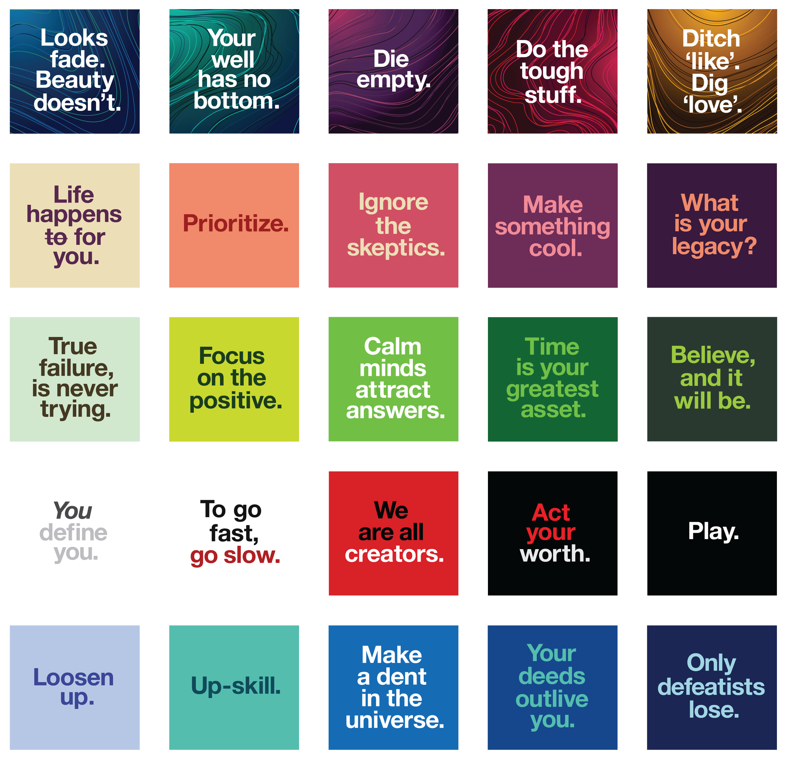 Overall, a lot of work went into creating this project and it was an incredible learning experience across many disciplines covering project planning, writing, art direction, video production, motion graphics, print production, storytelling, project management and more. Below are but a few examples from the over 600 motivational lines of copy that I wrote for this project.