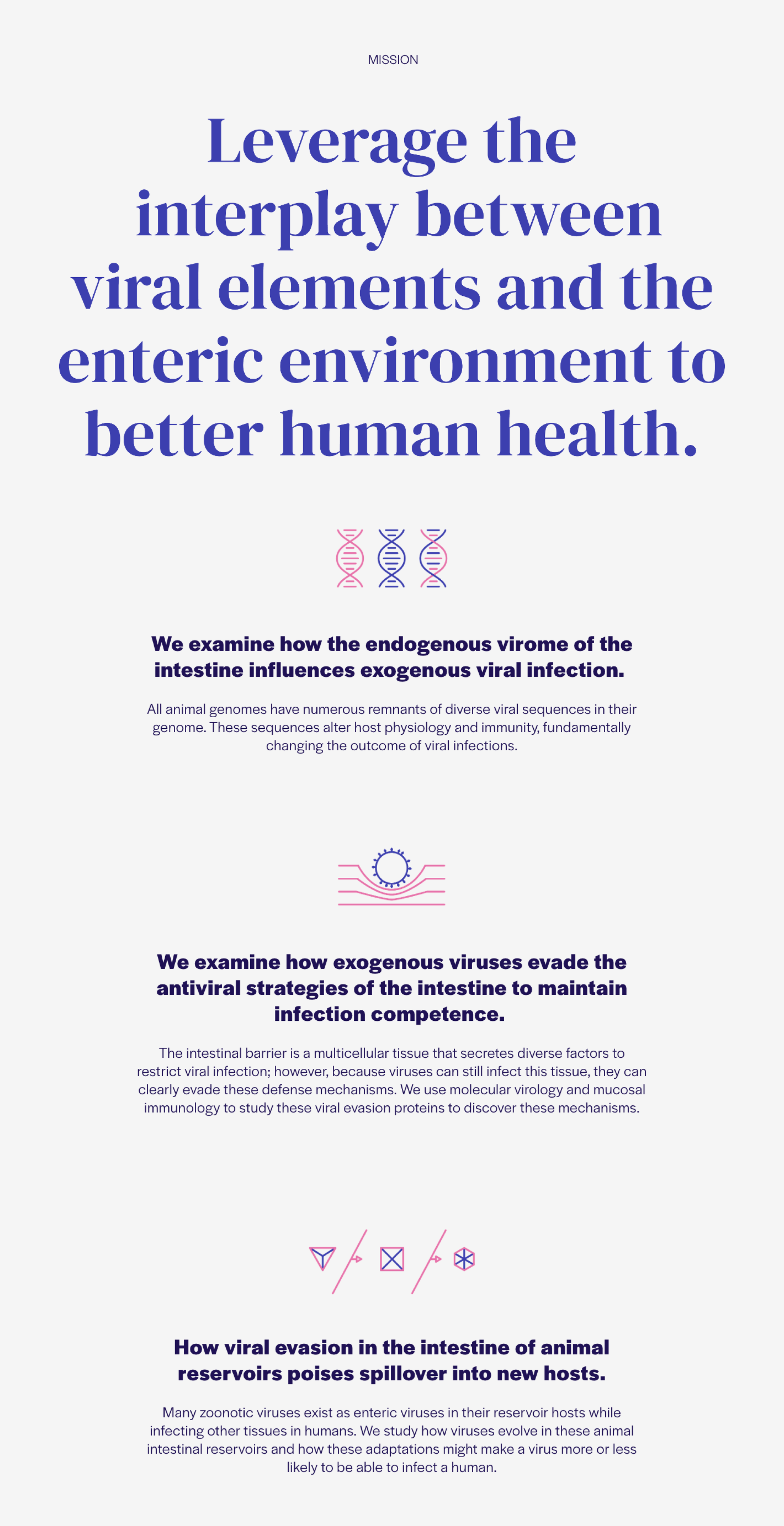 This page would ultimately be populated by all the members of the lab, so the header copy at the bottom of the page was meant to drive people to get in touch. Since the viral research was specifically with regards to the human intestines, this line seemed to be the perfect pun.